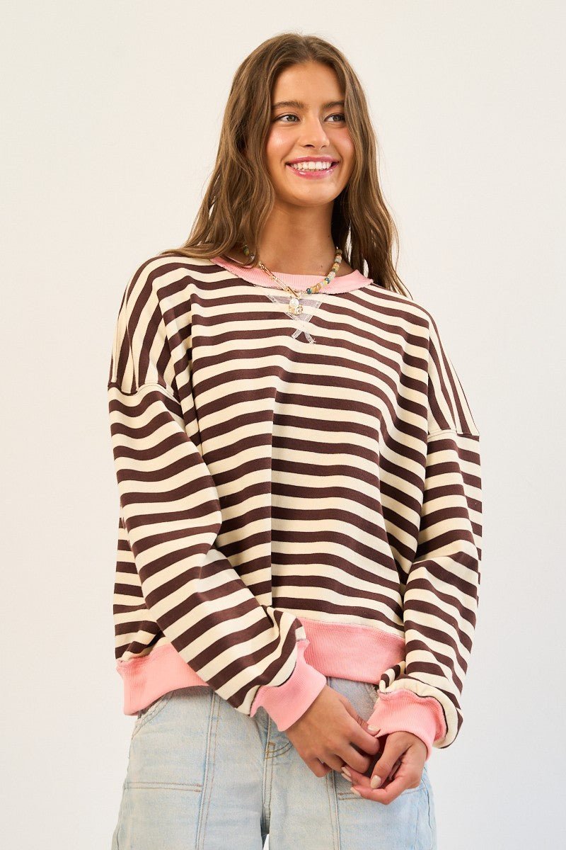 Comfy crewneck, traditional knit rib on neck / sleeve hem / bottom opening hem. A stylish and cozy sweatshirt is french terry. The standout feature is the contrast color block detailing, which adds a modern twist to the classic striped design.